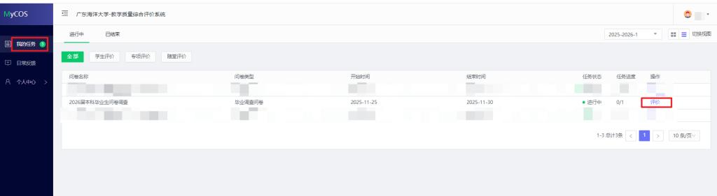 三、调查方式:登录 “广东海洋大学 - 教学质量综合评价系统”,在 “我的任务” 中查找对应调查问卷,完成填写并提交。