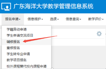 2.报名方式:登录广东海洋大学教学管理信息系统(以下简称教学管理系统,网址:https://jw.gdou.edu.cn),点击报名申请-辅修报名(如图),具体操作见附件1。